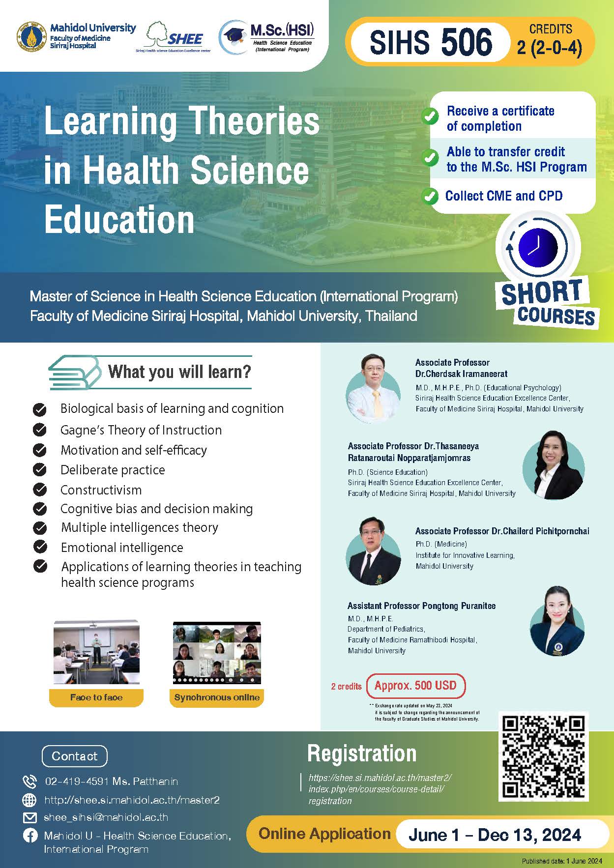 Biological basis of learning and cognition; motivation and self-efficacy; Gagne’s Theory of Instruction; deliberate practice, constructivism; cognitive bias and decision making, multiple intelligences theory, emotional intelligence; moral development and how to teach morality; basic principles of learning media in health science programs; applications of learning theories in teaching health science programs; searching and evaluating literature in the science of learning, presentations of research in learning.